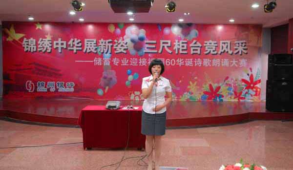 为迎接祖国成立60周年,展现锦州银行青年员工积极进取的精神风貌,抒发员工爱国爱行的炽热情怀,9月17日上午,零售银行部在海锦四楼会议室举办了以“锦绣中华展新姿,三尺柜台竞风采”为主题的诗歌朗诵赛。本次比赛,规模较高,行领导高度重视,各支行积极响应,共有28家支行、49名选手参赛,经过紧张激烈的角逐,有20名选手入围决赛。进入决赛的选手整体水平较高,他们精神饱满、落落大方,深情的演绎博得了评委及观众的一致赞许,为祖国的生日献上了一份精彩纷呈的贺礼。